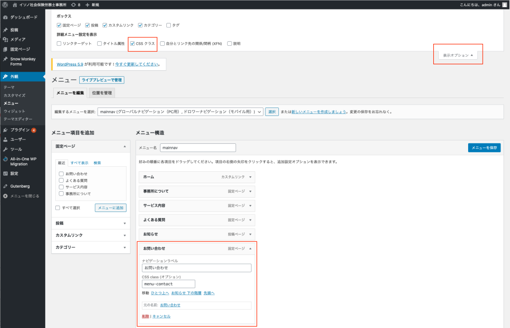 WordPress管理画面より、外観→メニュー→画面右上部にある「表示オプション」という項目をクリック→「CSSクラス」にチェック