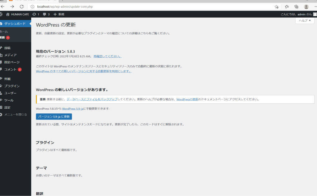 下記のような表示が出て、単純にクリックするだけではバージョンを更新できないようです。データベースとファイルのバックアップとは何の事でしょうか。