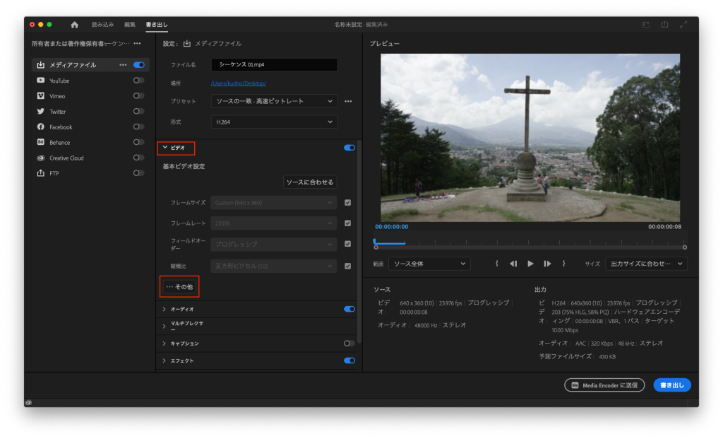 メニューバーから、ファイル→書き出し→メディア(ここまでは動画と同じ)