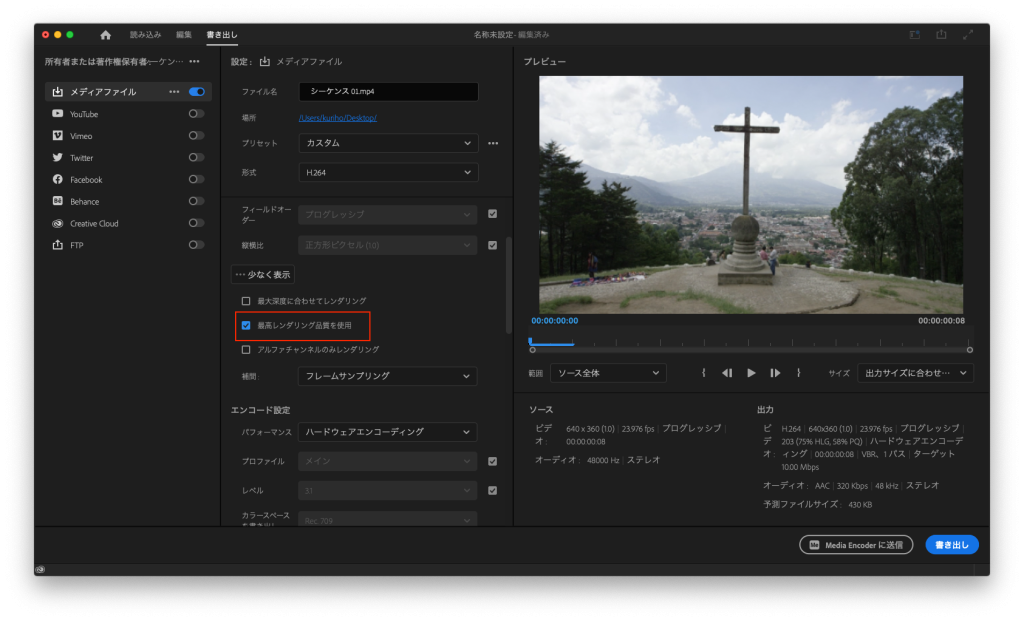 その中に、「最高レンダリング品質を使用」の項目があるので、チェックマークを入れて、[書き出す]をクリック