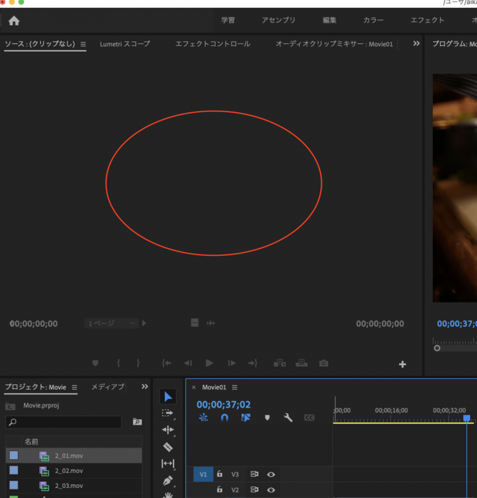 音声があるファイルであれば、ソースモニター下のアイコンではなく、ソースモニター内の 映像サムネールそのものをシーケンスにドロップしてみてください