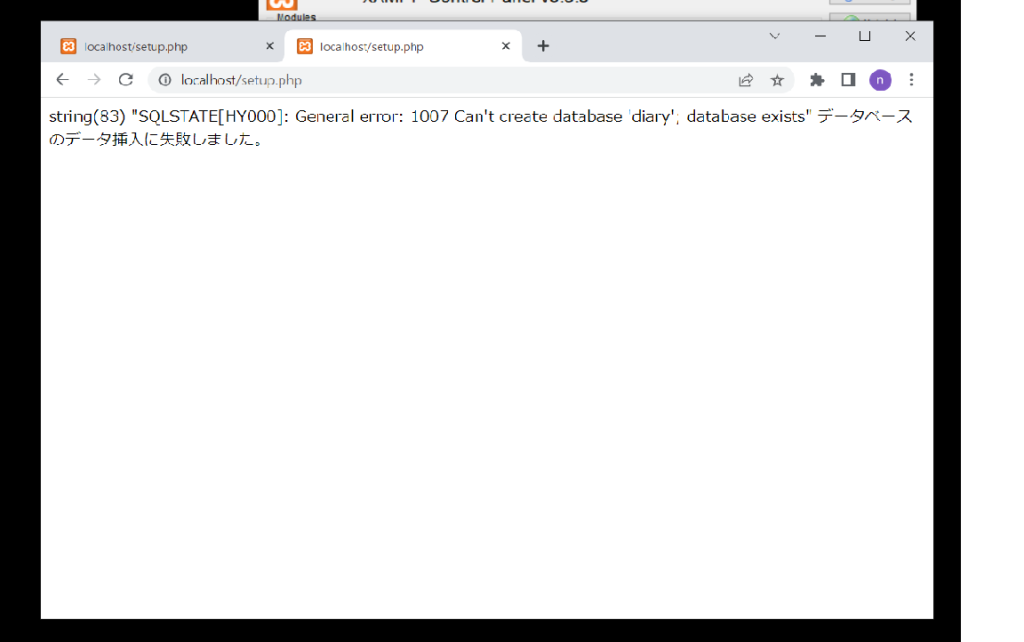 string(83) “SQLSTATE[HY000]: General error: 1007 Can’t create database ‘diary’; database exists” データベースのデータ挿入に失敗しました。