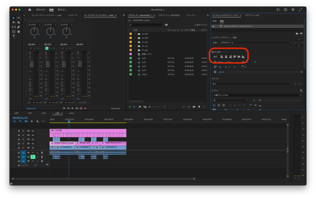 VTRでの説明にあったエッセンシャルグラフィック内の「水平方向中央」及び「垂直方向中央」ボタンについてなのですが、私のPremiere Proではその表示がなく、表示方法を探してみたのですが見つけられない為、その方法を教えていただけますでしょうか。どうぞよろしくお願い致します。