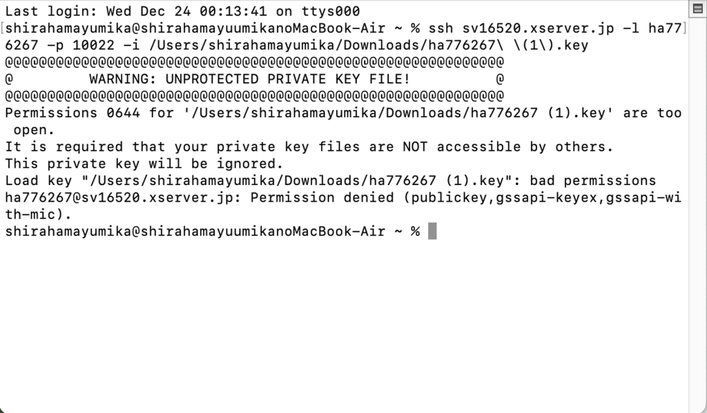 ターミナルを開き、以下のコマンドを実行して鍵ファイルの権限を適切に設定(自分だけが読み書きできる状態に)してください。